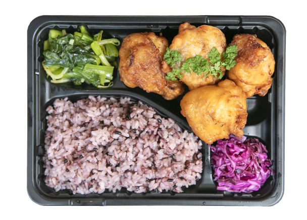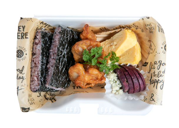 おかず2品とからあげ、花藻塩を使ったおにぎらず入りのお弁当です。