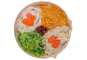 4種類のお野菜を特製ナムルタレで味付けし、下に黒米を敷き詰めたビビンバ丼です。 アクセントのコチュジャンは、もち米を発酵させ1ヶ月寝かせて味に大変コクとツヤがあります。コチュジャンは伊勢神宮奉納商品です。